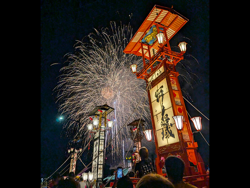 重蔵神社大祭で打ち上げられた花火とキリコ -