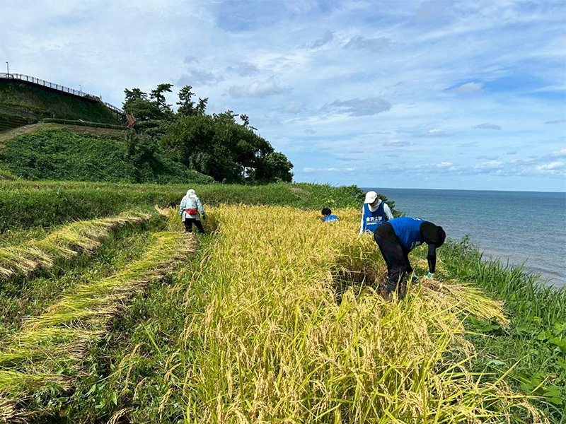 9月19日, ボラさぽの学生は,輪島市千枚田の稲刈り支援活動を行いました。同活動は昨年に続いて2年目で,春には千枚田にて田植え活動も行いました。