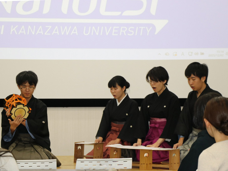 はじめに,和田隆志学長から開会のあいさつがあり,本学が文部科学省「未来を先導する世界トップレベル大学院教育拠点創出事業(FLAGs)」に採択されたことに触れ,次世代を牽引する博士人材の育成を強化すると述べました。続いて,本学能楽サークル「宝生会」による謡(うたい)および小鼓の演奏,さらに,留学生による出⾝⼤学紹介と本学の魅力についての発表があり,国際日本研究教育センターの佐藤智哉准教授の進行もあって会場は大いに盛り上がりました。