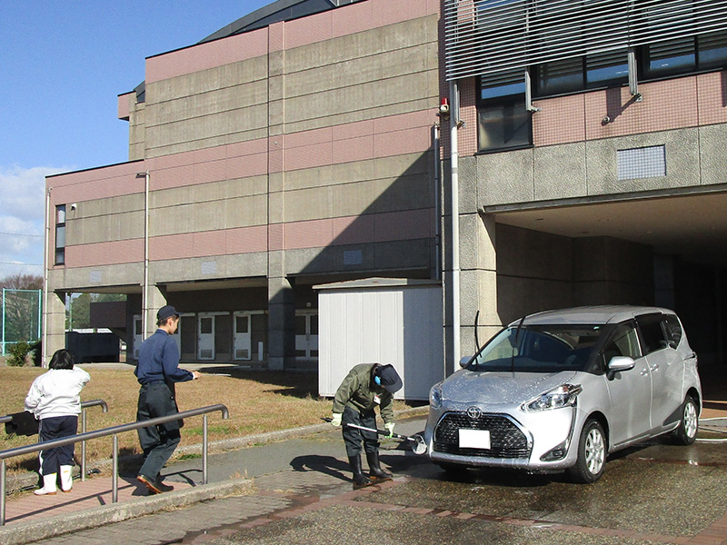 樹木剪定を実施した町会ごみ集積場周辺は,伸びてくるとごみ集積場の利用者,歩行者および自動車などの妨げとなります。作業班の生徒は,近隣の方々の道路の通行をスムーズにすること,利用者の方々の利用のしやすさを目的意識として持ちながら,丁寧に剪定や枝の収集作業を行いました。また,附属学校園共用車は,作業班の生徒が,隅々まで丁寧に洗車および清掃を行い,新車のような美しい仕上がりとなりました。