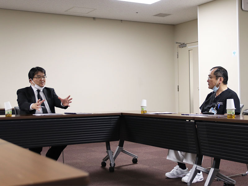 意見交換する先﨑審議官(左)と吉崎附属病院長 -
