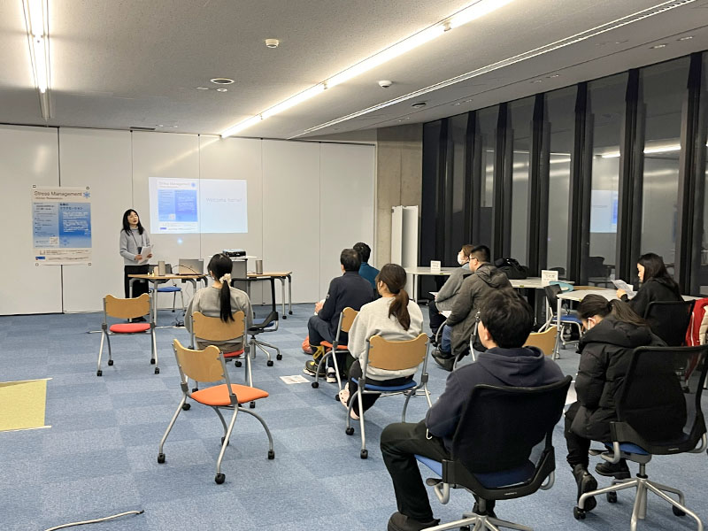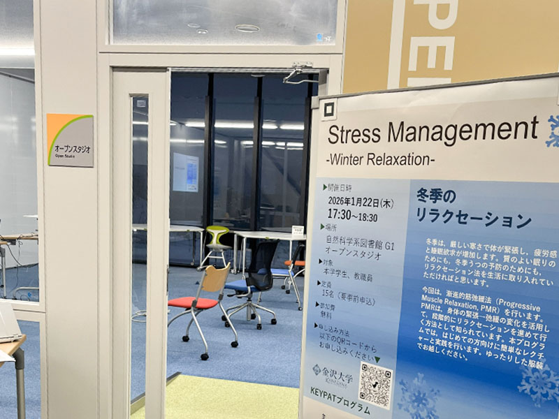 1月22日,こころのケアを目的とした本学の支援チーム「KEYPAT」(※1)は,「ストレスマネジメント 冬季のリラクセーション」と題し,「KEYPAT」メンバーがリラクセーションのレクチャーと実践を行うプログラムを自然科学系図書館G1オープンスタジオで実施し,本学学生や教職員11名が参加しました。