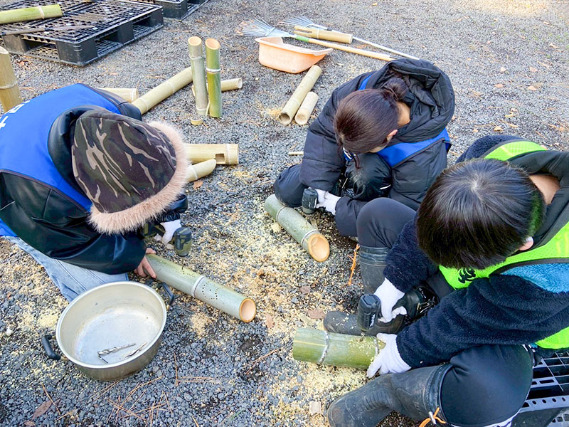 竹灯籠の点灯は昨年に続いて2年目で,12月28日に竹を加工した後,追悼の想いを込めてデザインを施しました。31日には,参拝会場設営や門松の準備や設置,境内清掃などを手伝い,竹灯籠の配置場所の調整をしました。