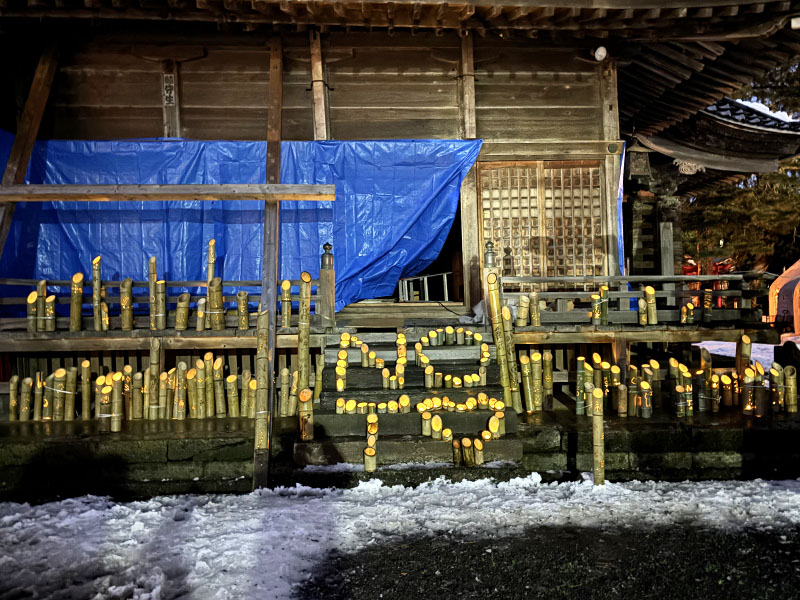 1月1日,本学の課外活動団体である金沢大学ボランティアさぽーとステーションの学生と顧問で人間社会研究域経済学経営学系の原田魁成講師は,輪島市重蔵神社で, 令和6年能登半島地震で被災された方々を追悼する竹灯籠の点灯を行いました。
