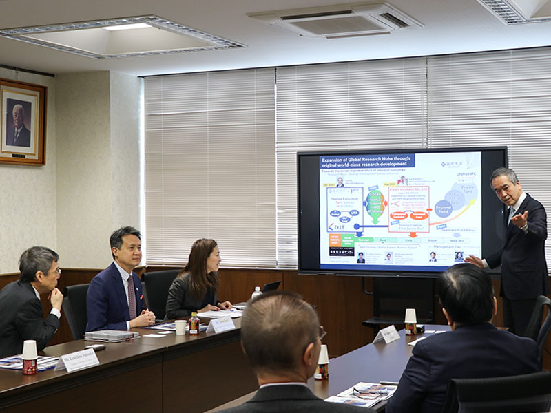 意見交換では,研究成果の社会実装,大学が関与するスタートアップとイノベーションのエコシステム構築の重要性,知的財産に関する意識の向上,さらには,知的財産・リスク管理教育に関する協力について,話し合われました。