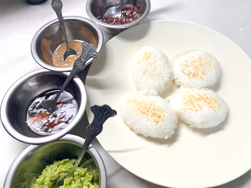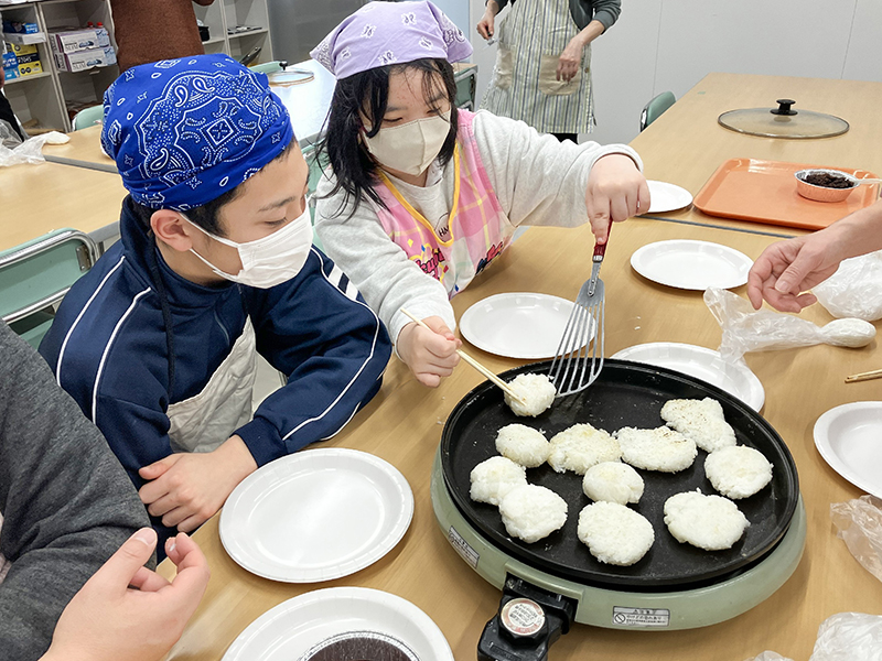 五平もちづくりでは,ご飯をつぶして思い思いに形を作って焼き上げる工程を楽しんだほか,4種類の色・味のたれ・餡から自分の好きなものを選び,組み合わせて味わう体験ができました。また,お吸い物にはさまざまな具材が入り,栄養バランスのよい一品となりました。