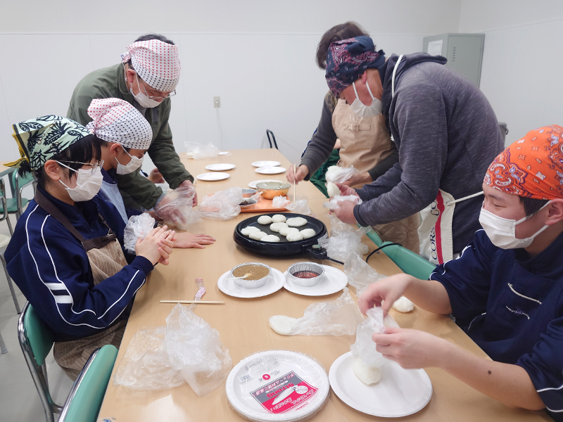 2日26日,本学の支援チームKEYPAT(※)は,石川県立七尾特別支援学校珠洲分校を訪問し,食育プログラムを企画運営しました。小学部から高等部までの児童・生徒と教諭ら約30名が参加し,管理栄養士の指導のもと「いろいろ五平もち」と「まぜるだけお吸い物」を作りました。