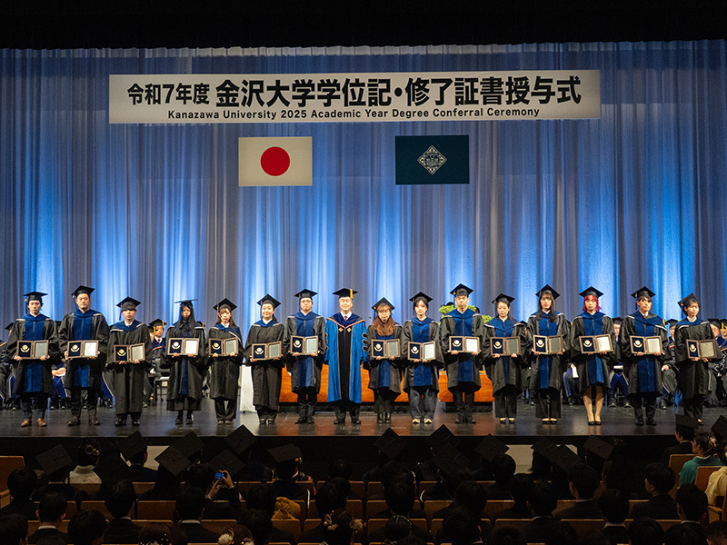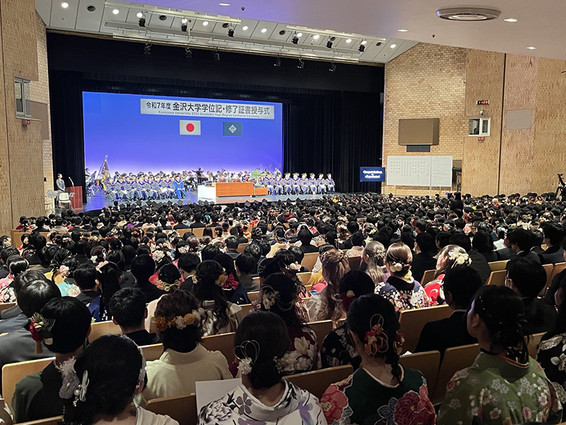 3月20日,金沢歌劇座において,令和7年度金沢大学学位記・修了証書授与式を挙行し,卒業者1,727名,修了者等773名,計2,500名に学位記または修了証書が授与されました。