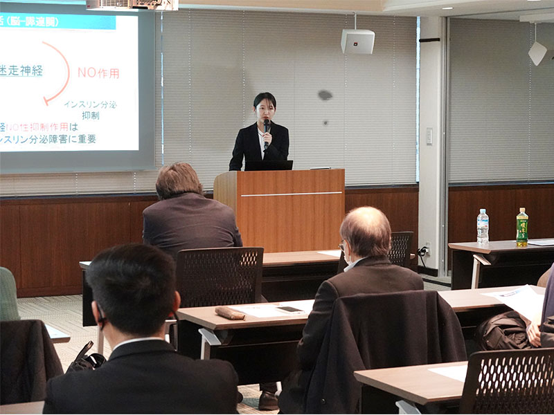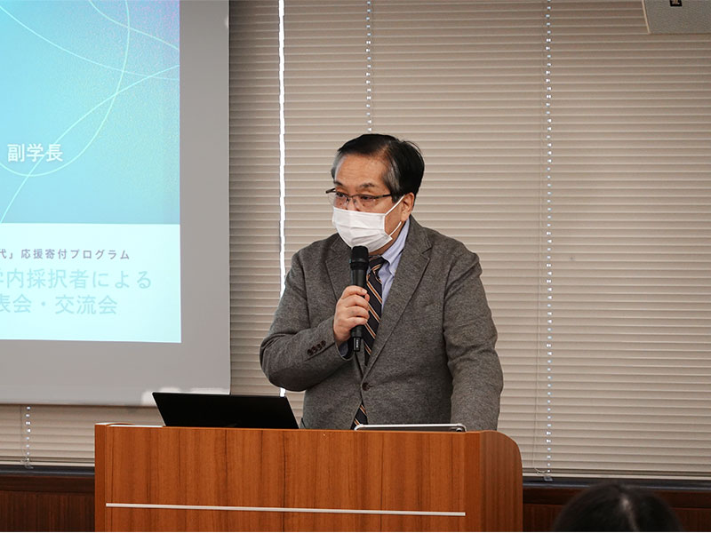 発表会では,はじめに,中村慎一理事による開会挨拶がありました。続いて,この支援を受けた若手研究者4名が,それぞれ医学・保健学・融合科学の各分野における先新的な研究成果を紹介しました。