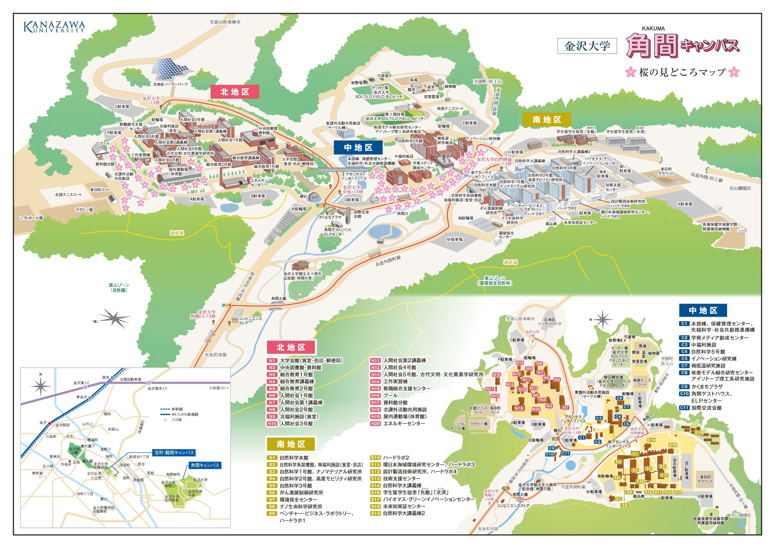 角間キャンパスでの主な桜の見どころは,下記マップのとおりですが,掲載箇所以外にも多くの桜があります。