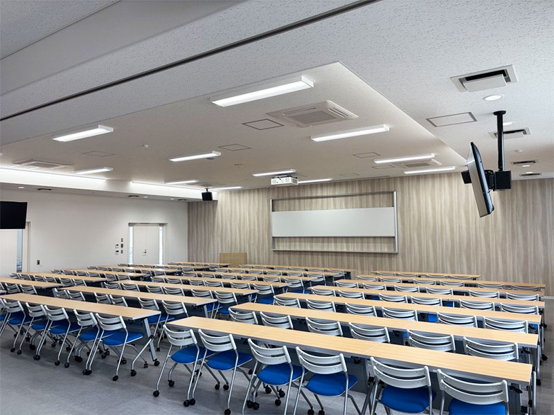 施設内は,1階に94名収容の講義室2室と122名収容の講義室2室を設けました。これらの講義室は移動間仕切りを開放することで2室を1室として利用でき,それぞれ最大で約200名,約250名の収容が可能です。2階には情報工学分野・デジタル融合分野の研究活動スペースに加え,キッチンやミーティングスペースを設けた交流エリアを整備し,利用者間の活発なコミュニケーションを促す設計としています。